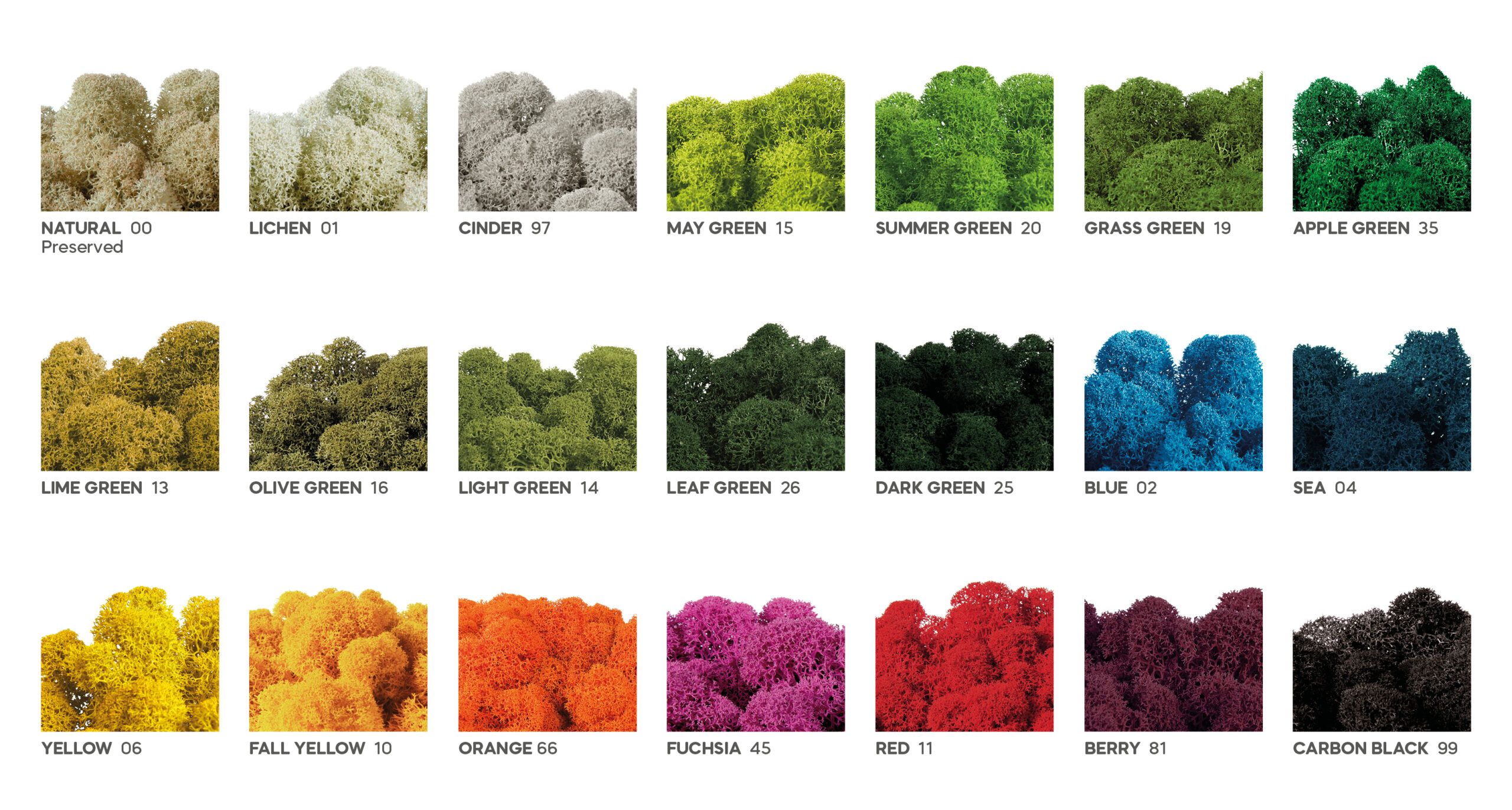 Polarmoss colored moss known for its outstanding quality. It is manufactured from our own reindeer moss that is carefully selected from naturally growing reindeer moss beds in the northern forests. It is colored and preserved by hand and manufactured with care.